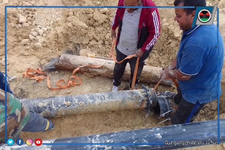 قام مركز خدمات يفرن بمكتب خدمات يفرن جادو التابع لإدارة التشغيل والصيانة بمنطقة الجبل الغربي بأعمال صيانة وإستبدال خط مياه رئيسي متهالك قطر (250) بطول (4) متر الخط المغذي لمدينة يفرن.