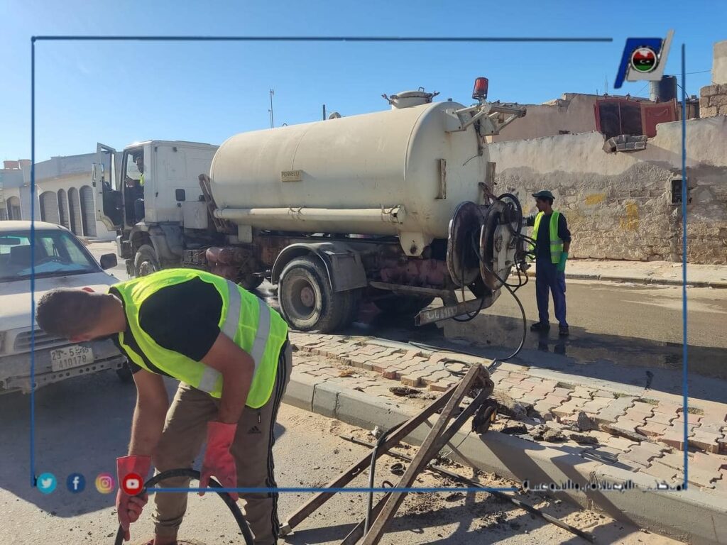 قامت فرقة شبكات الصرف الصحي بمكتب خدمات الزاوية التابع لإدارة التشغيل والصيانة الغربية، بتنظيف وتسليك خط الصرف الصحي الرئيسي بشارع عمر المختار بالتحديد منطقة اولاد جربوع.