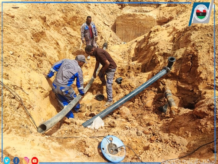 قام فنيين صيانة شبكات المياه بالمكتب بأعمال صيانة لخط مياه بقطر 4بوصه نوع دكتايل وتركيب وصلات بوليثلين عليه بمدينة سبها على طريق دائري المهدية .