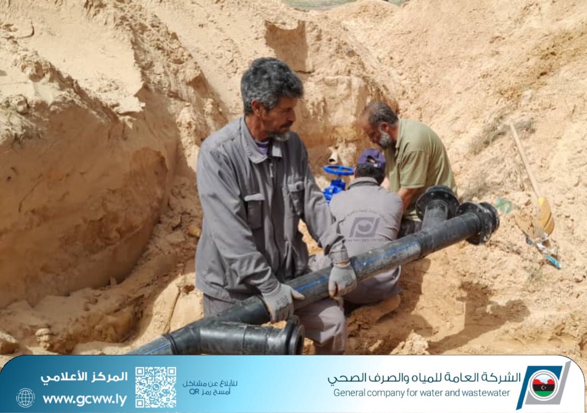 قامت فرقة الصيانة لشبكات المياه بمكتب خدمات صرمان التابع لإدارة التشغيل والصيانة بالمنطقة الغربية بأعمال توصيل وصيانة خط مياه بقطر 90 بوتلين بالقرب من مسجد غفران بمثلث الجديعات .