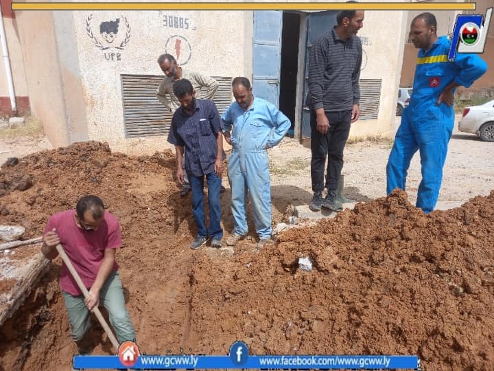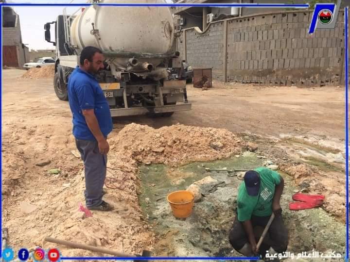 قامت فرقة الصيانة لشبكات الصرف الصحي بمكتب خدمات صبراتة التابع لإدارة التشغيل والصيانة الغربية ، بصيانة خط الصرف الصحي بقطر 2.5 ومسافة 30 متر بالقرب من مسجد الرحمن