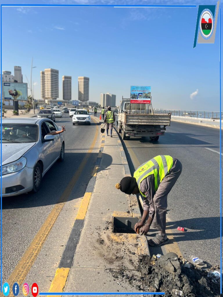 قامت الفرق التابعة لمكتب خدمات غرب طرابلس بإدارة منطقة طرابلس بتنظيف غرف تصريف مياه الامطار الرئيسية والفرعية وكذلك تسليك الخطوط مابين الغُرف لضمان تصريف مياه الأمطار بالشكل المطلوب ونقل المخلفات ، طريق شط .
