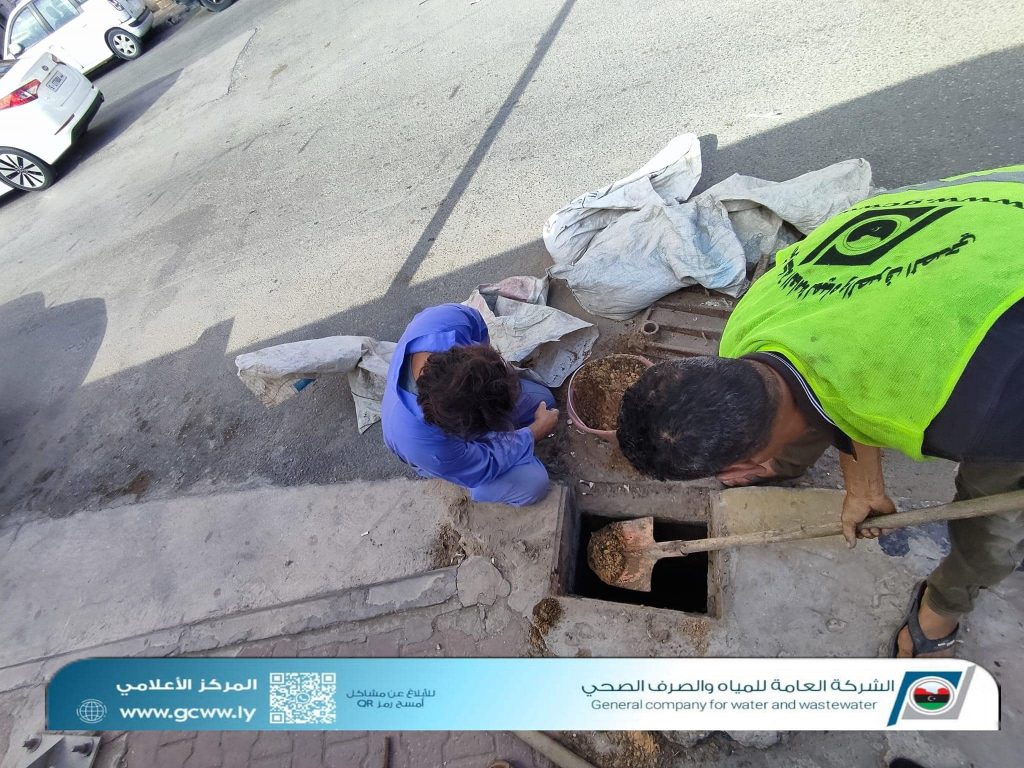 للحملة الموسمية بتنظيف وتهيئة منظومة تصريف مياه الأمطار التابعة لمكتب خدمات الزاوية بإدارة التشغيل والصيانة الغربية حيثُ يتم تنظيف ونقل المخلفات من غرف تصريف مياه الامطار بالقرب من مصحة رويال .