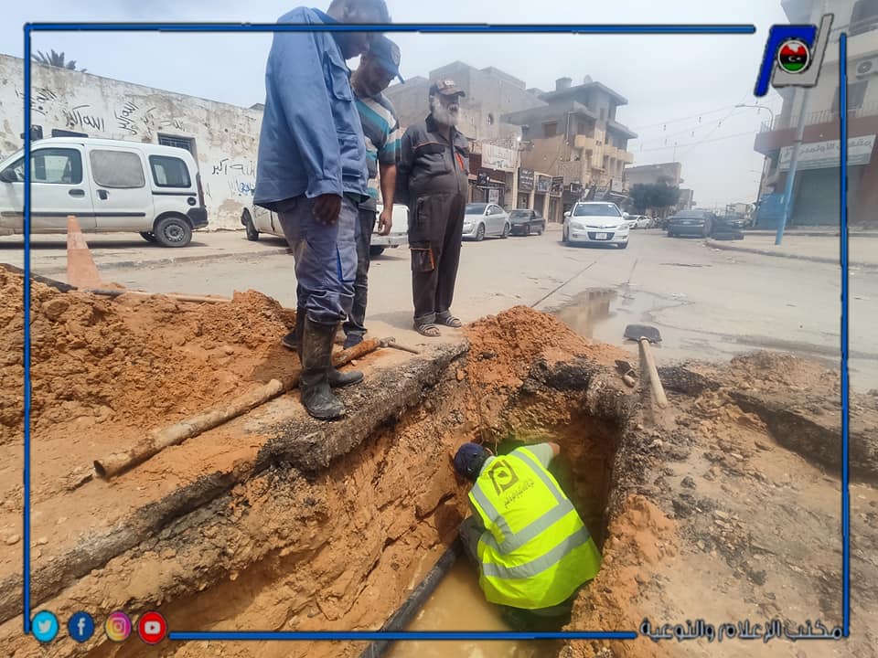 قام وحدة صيانة شبكات المياه التابعة لمركز خدمات الزاوية التابع لمكتب خدمات الزاوية التابعة لادارة التشغيل و الصيانة بالمنطقة الغربية بصيانة خط مياه رئيسي الاستعمال اليومي بطريق العام بشارع الأولمبي بالتحديد امام عمارة الهلال الأحمر الليبي .